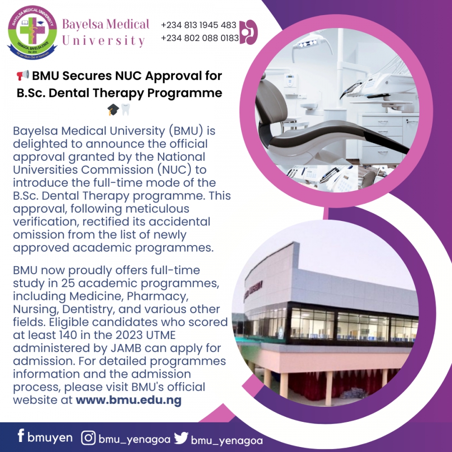 In a proactive response, the Executive Secretary of the National Universities Commission has assumed responsibility for the omission and has diligently overseen the necessary updates to incorporate the B.Sc. Dental Therapy programme into BMU's academic offerings in full-time mode This approval also extends to the Joint Admissions and Matriculation Board (JAMB) and the National Youth Service Corps (NYSC), both of which will be duly informed of this new addition to our academic programmes.